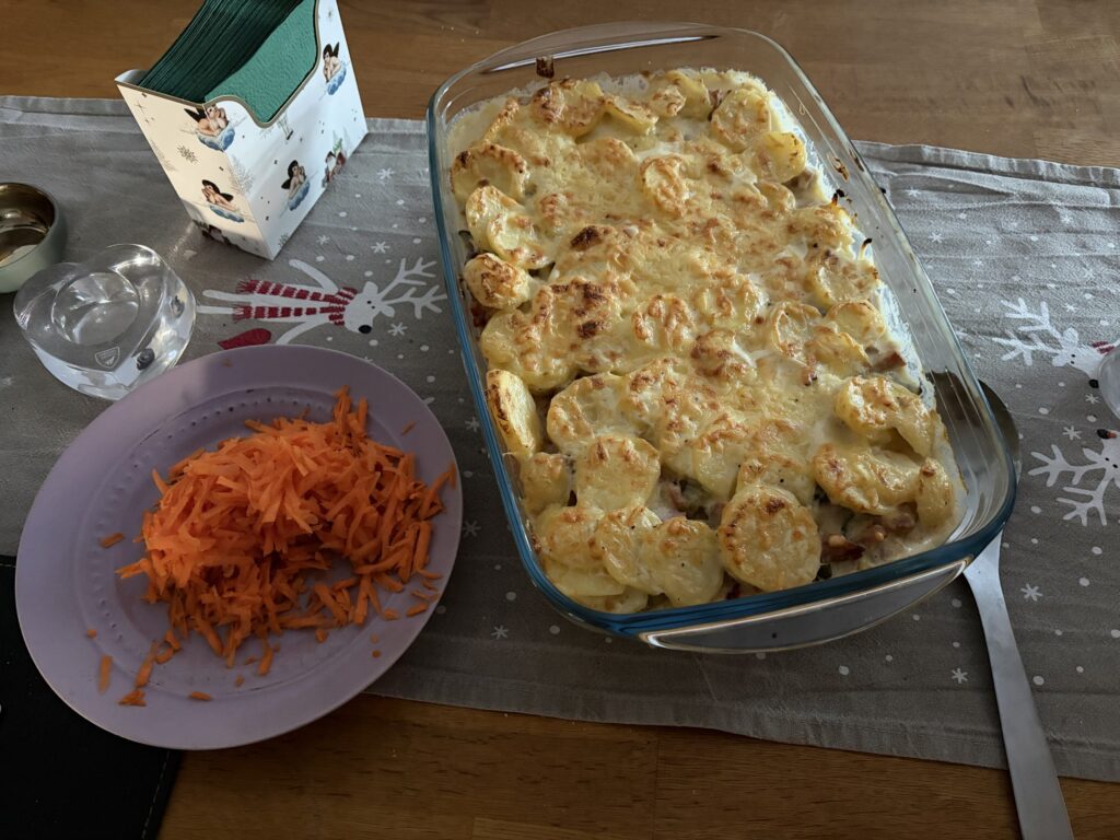 Skala och skiva potatisen – koka i grädde, Creme fraiche, lite mjölk, Svartpeppar tills dom är mjuka.